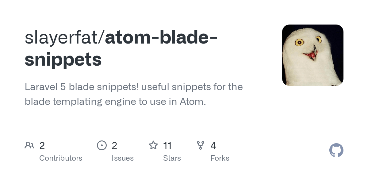Forked from cronos87.thanks for this :)))) We can't wait to see what you build with it. At github, we're building the text editor we've always wanted: Laravel + php snippets for atom. Laravel snippets for atom text editor features. My collection of laravel and php snippets. Hackable to the core, but approachable on the first day without ever touching a config file. At github, we're building the text editor we've always wanted: