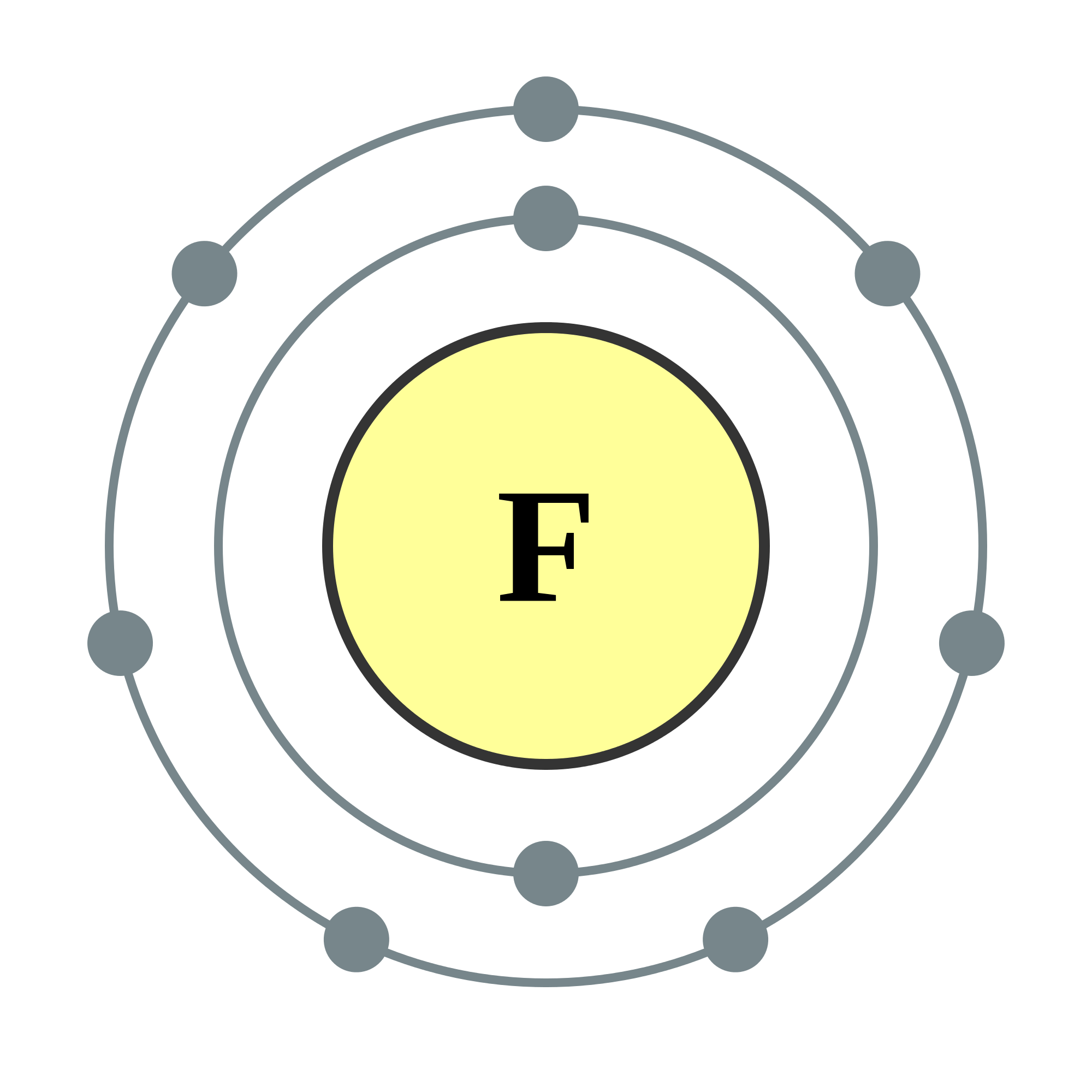 A 3d model of the atom fluorine, a description on the composition, structure and.. .. This shell is drawn after the first electron shell.